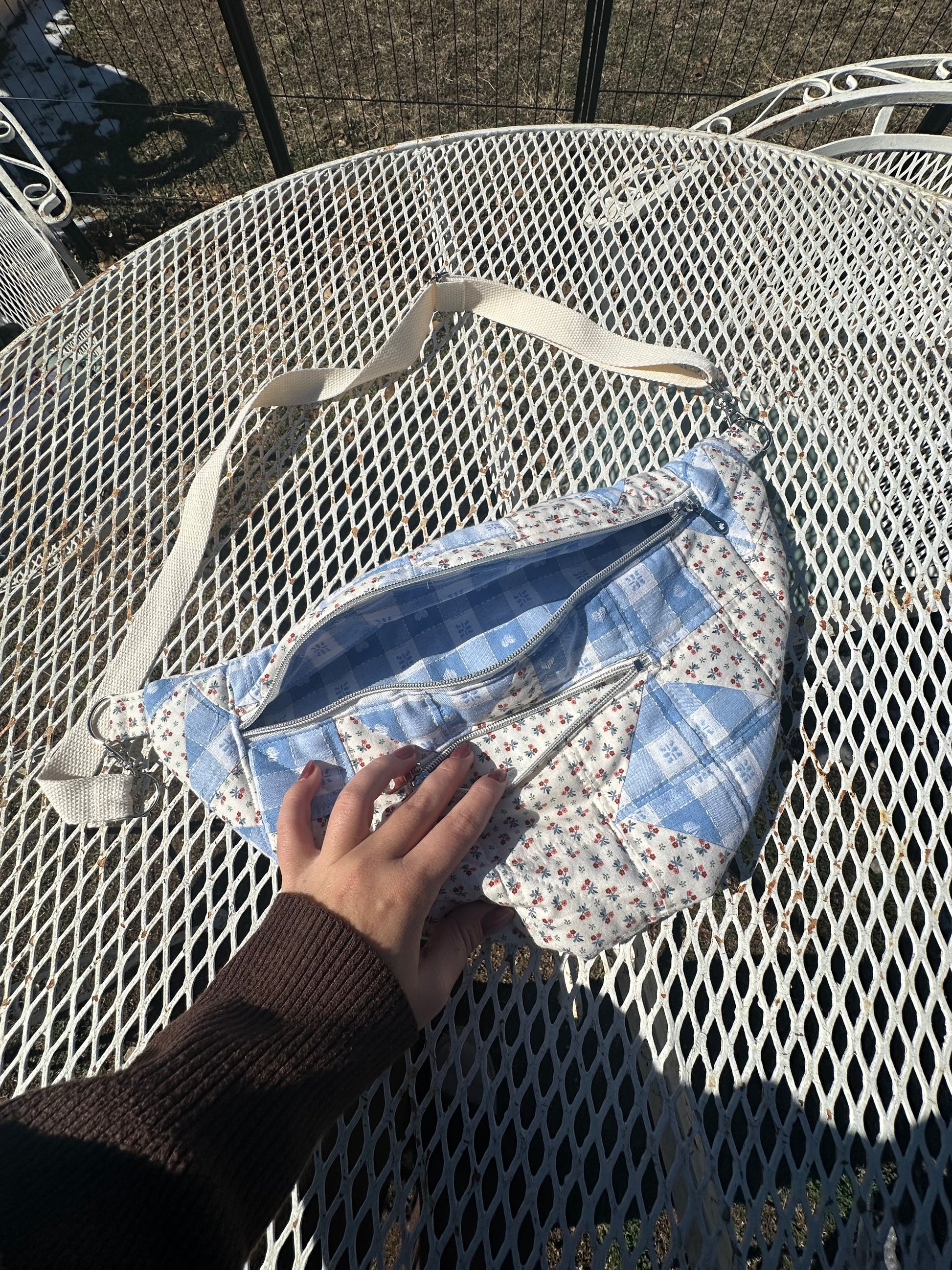 All Fannie’s are made from vintage quilts, have two zipper pockets and a removable adjustable strap