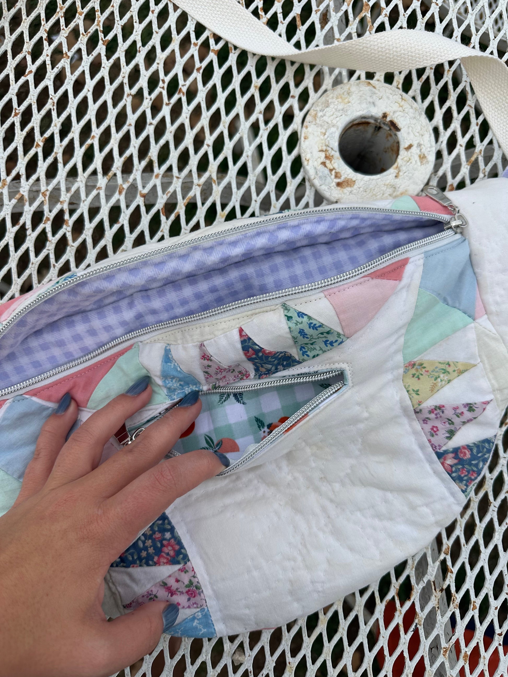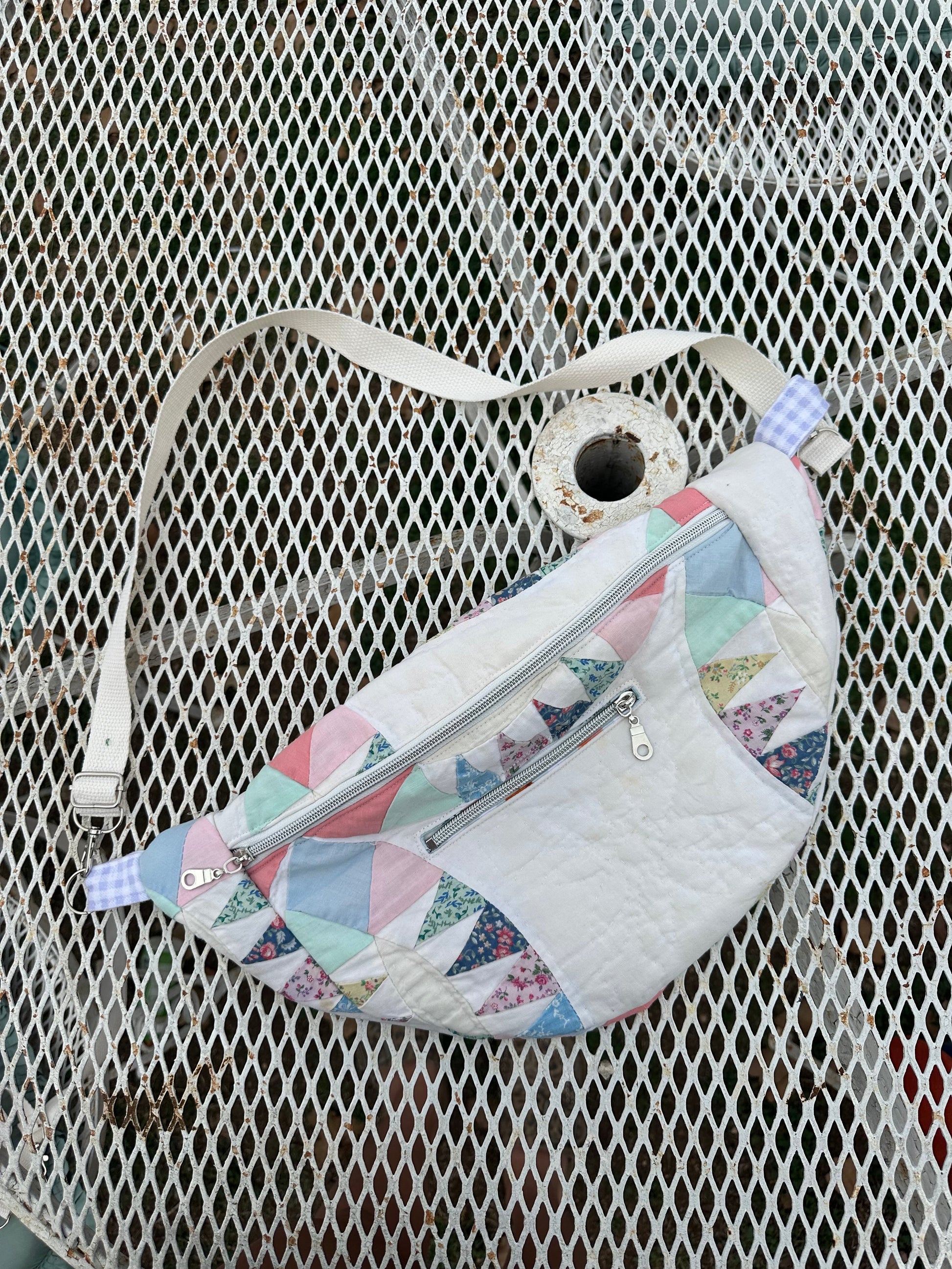 All bags are made with second hand quilts, have removable straps and a mini front pocket as well and the big pocket.