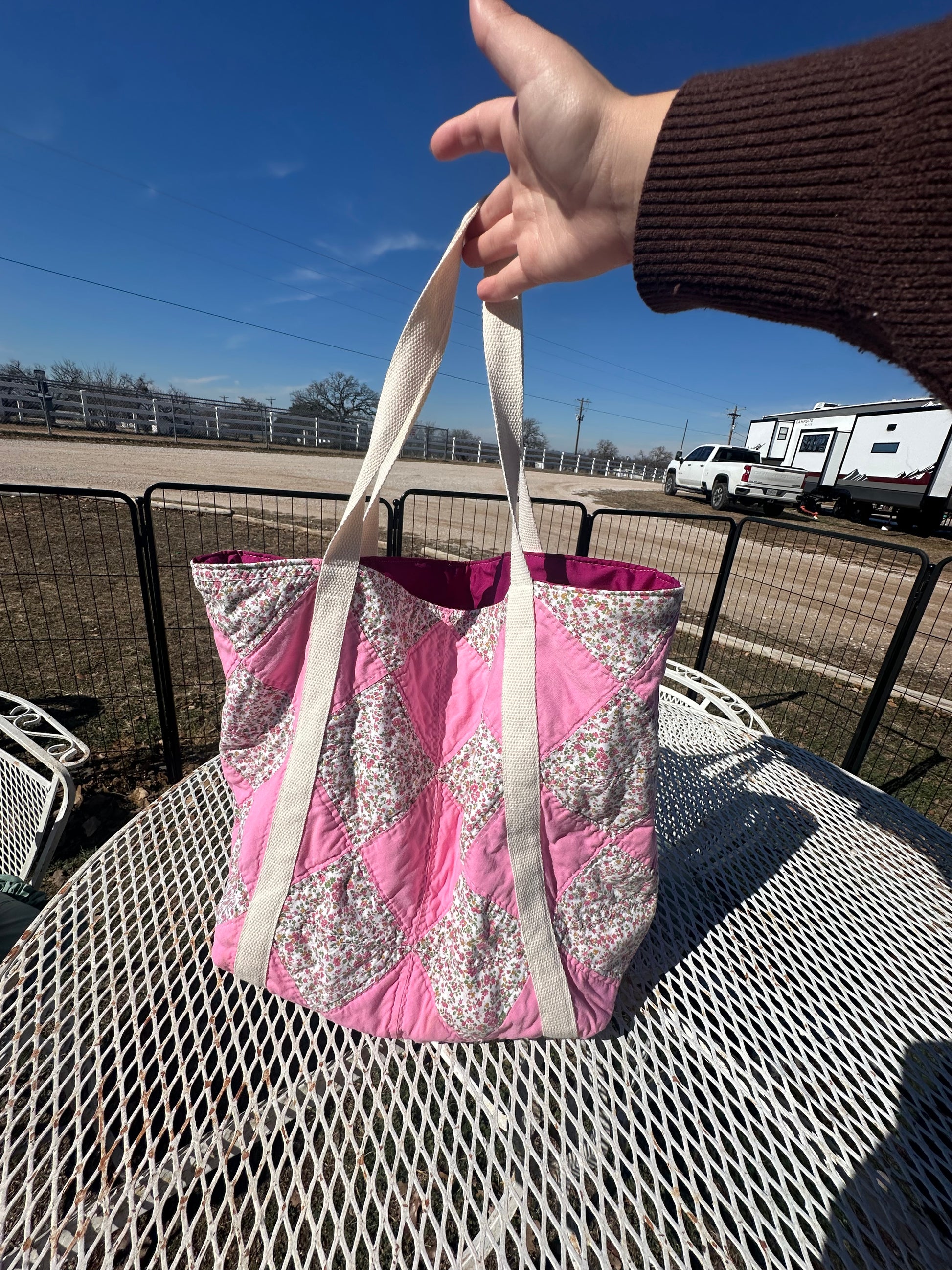 Tote is medium size, made with vintage quilt scraps