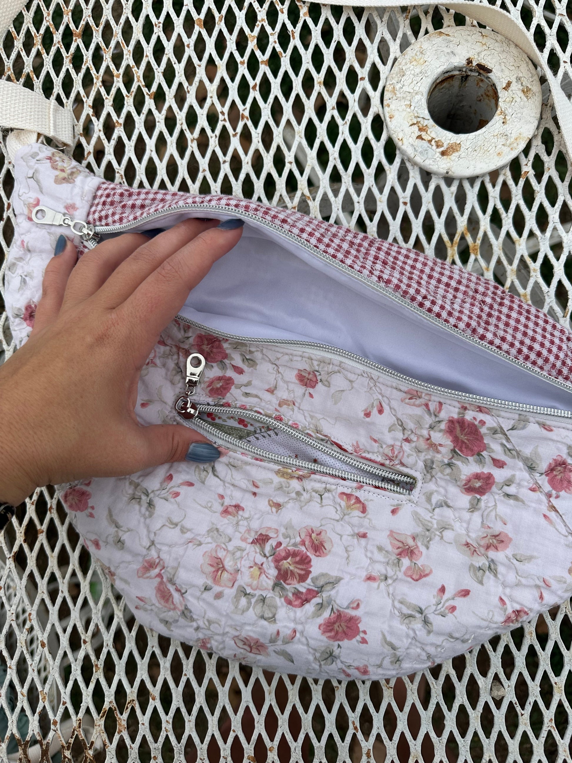All bags are made with second hand quilts, have removable straps and a mini front pocket as well and the big pocket.