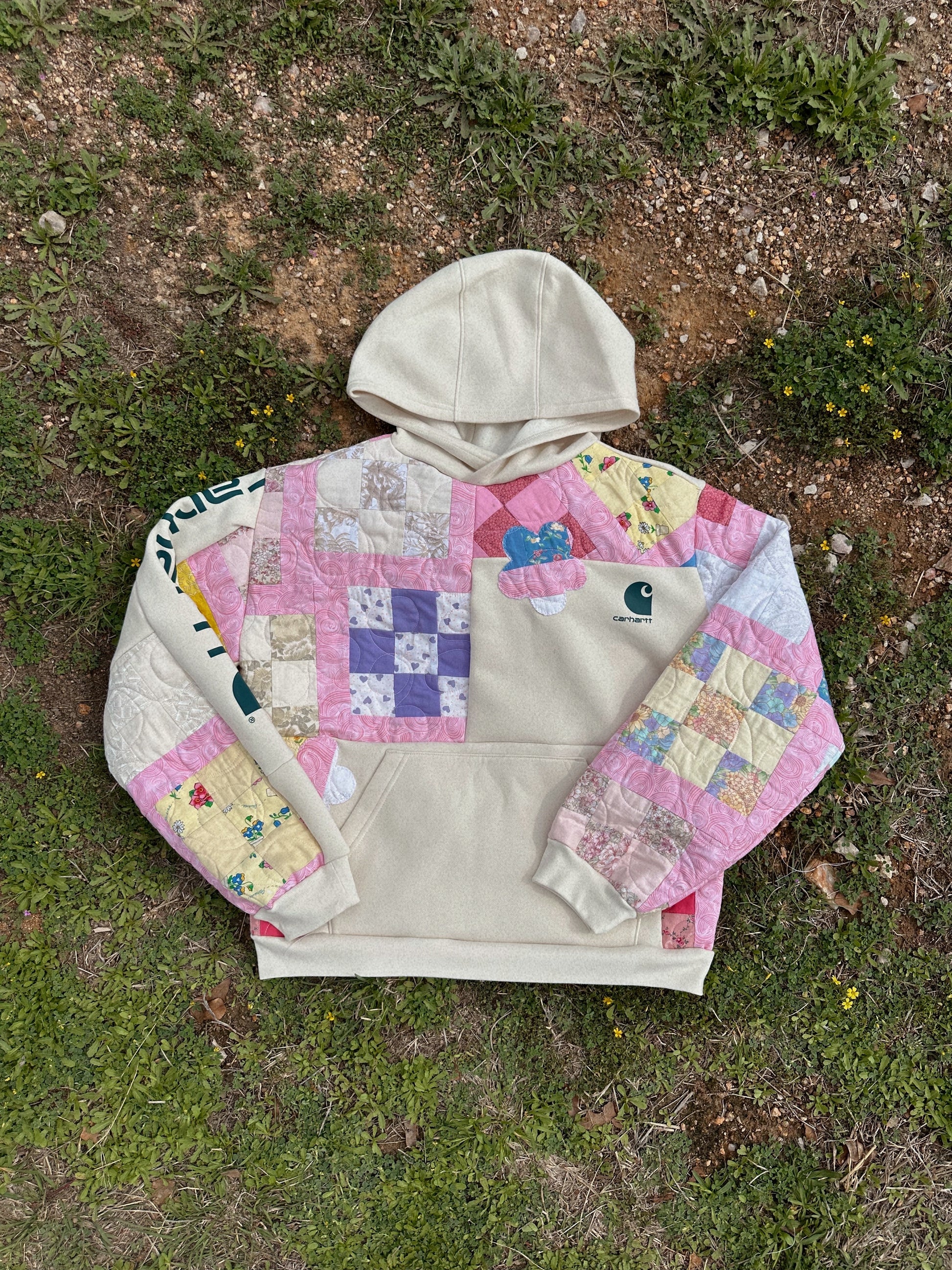 Made from a thrifted Carhartt hoodie and a thrifted handmade quiltย