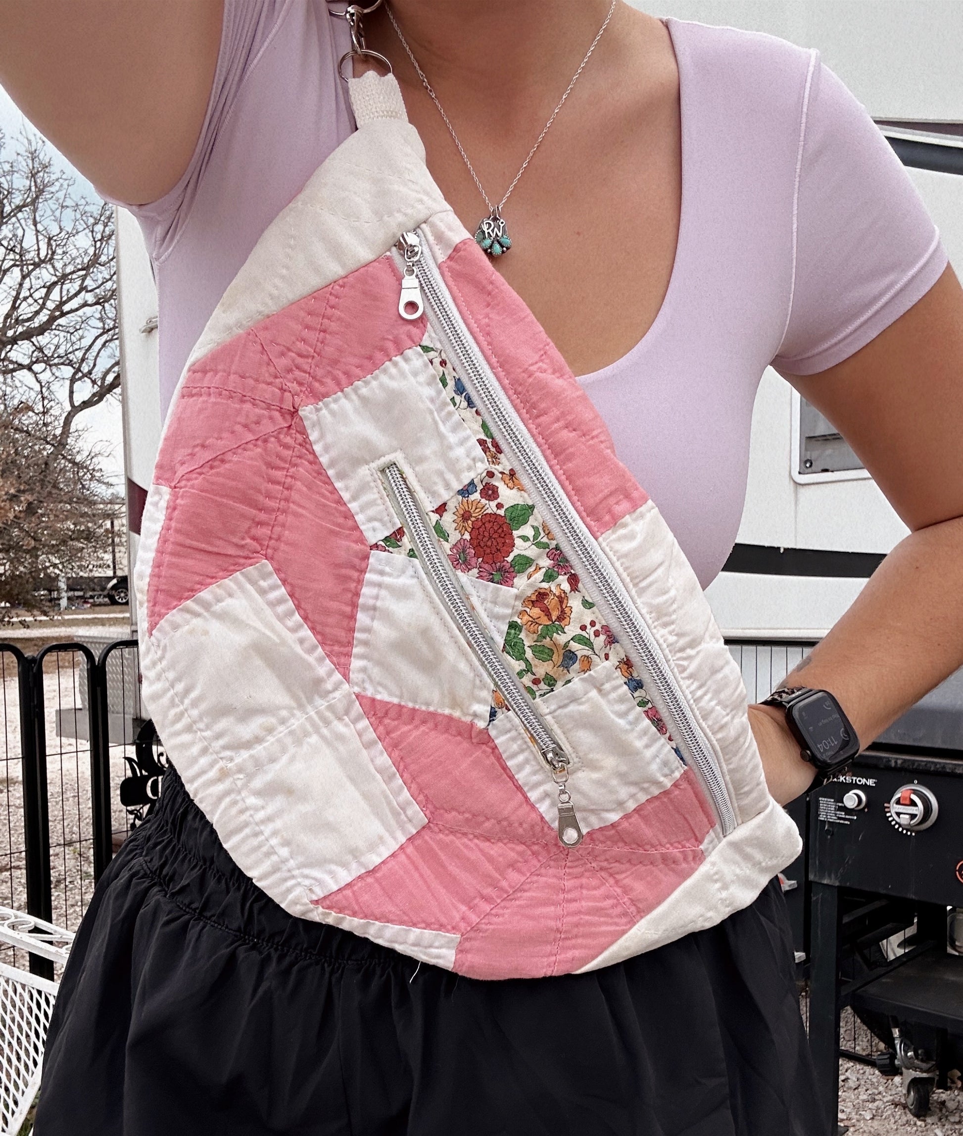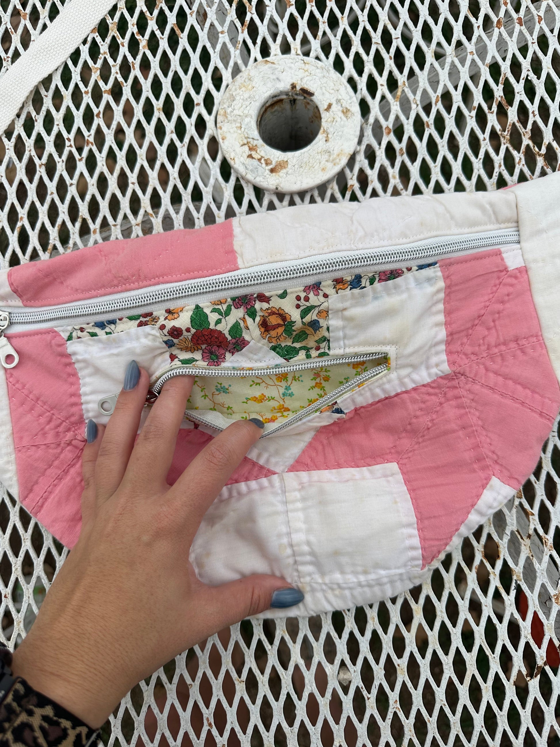 All bags are made with second hand quilts, have removable straps and a mini front pocket as well and the big pocket.